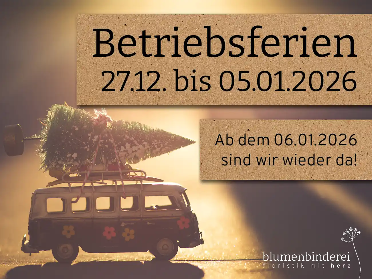 Nach einer wundervollen, aber auch intensiven Advents- und Weihnachtszeit gönnen wir uns ein paar Tage Erholung und machen eine kleine Winterpause. Vom 27.12. bis 05.01.2026 bleibt die Blumenbinderei geschlossen. Ab dem 06.01.2026 sind wir wieder für euch da!